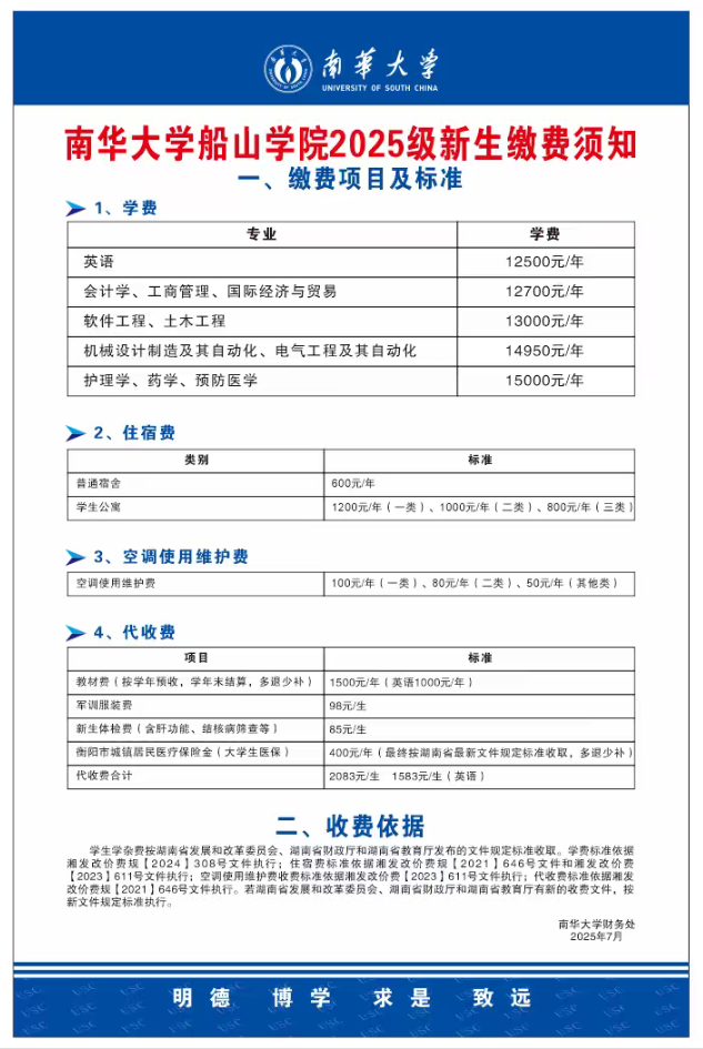 3.收费依据:学生学杂费按湖南省发展和改革委员会、湖南省财政厅和湖南省教育厅发布的文件规定标准收取。学费标准依据湘发改价费规【2024】308号文件执行;住宿费标准依据湘发改价费规【2021】646号文件和湘发改价费【2023】611号文件执行;空调使用维护费收费标准依据湘发改价费【2023】611号文件执行;代收费标准依据湘发改价费规【2021】646号文件执行。若湖南省发展和改革委员会、湖南省财政厅和湖南省教育厅有新的收费文件,按新文件规定标准执行。