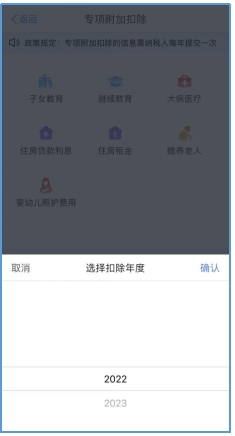 点击“婴幼儿照护费用”后,选择扣除年度为2022年(由于新政策自2022年1月1日施行,纳税人无法在2021年及以前年度中填报),点击“确认”后,系统会提示需要准备的子女信息(包括子女姓名、国籍、身份证类型、身份证号码、子女出生日期等),准备完毕后点击“进入填报”。
