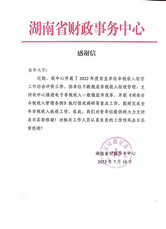 日前,PA视讯官方网站PA视讯官方网站收到湖南省财政事务中心感谢信,继2020年、2021年度荣获省直财政票据管理先进单位后,在2022年度省直单位非税收入征管工作综合评价工作中再次得到湖南省财政事务中心表扬。