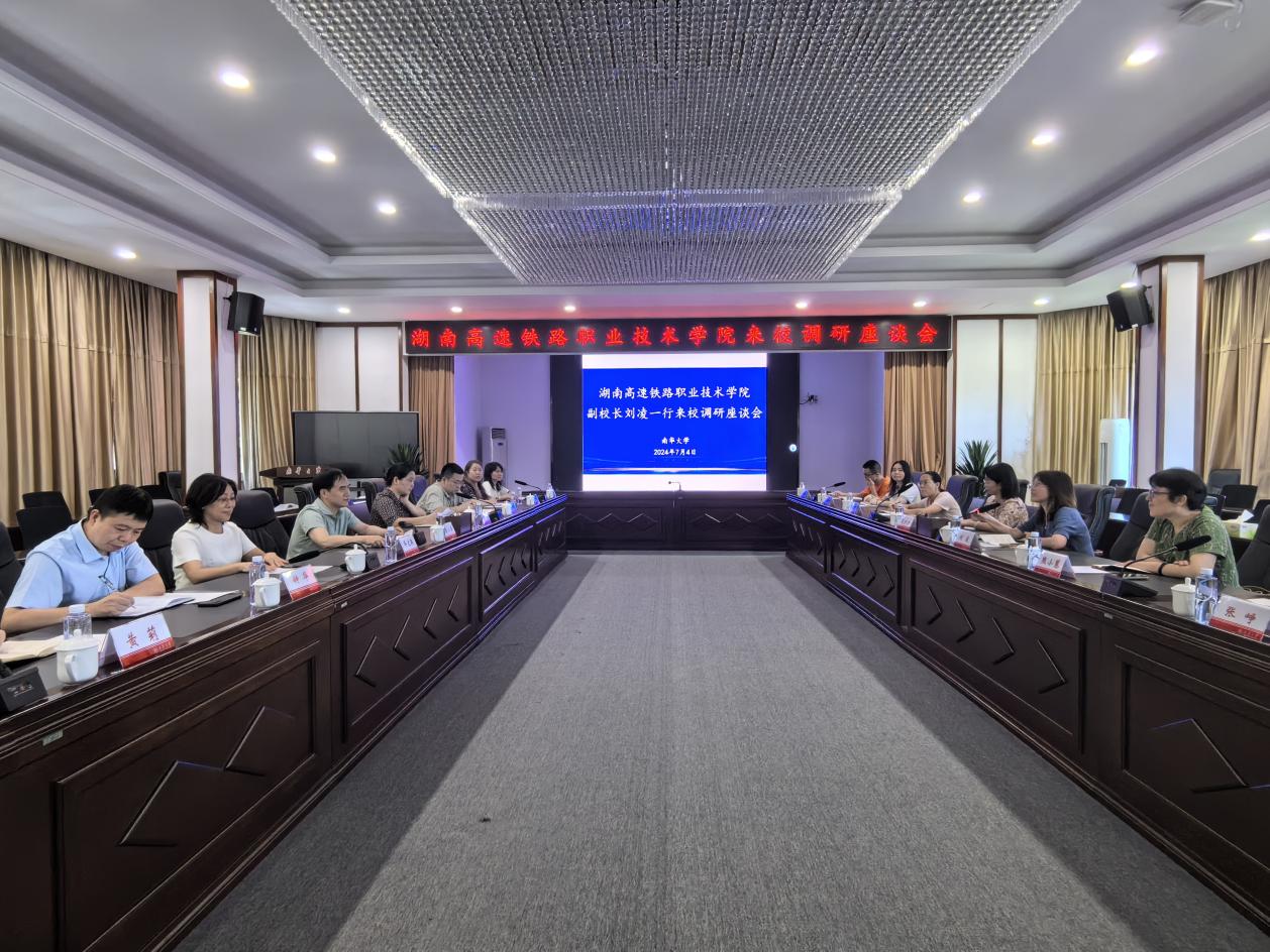 7月4日,湖南高速铁路职业技术学院副校长刘凌一行9人来我校调研交流,PA视讯官方网站牵头在第一办公楼视频会议室召开座谈会,会议由党委副书记雷小勇主持,PA视讯官方网站处领导班子及各科室负责人参加。